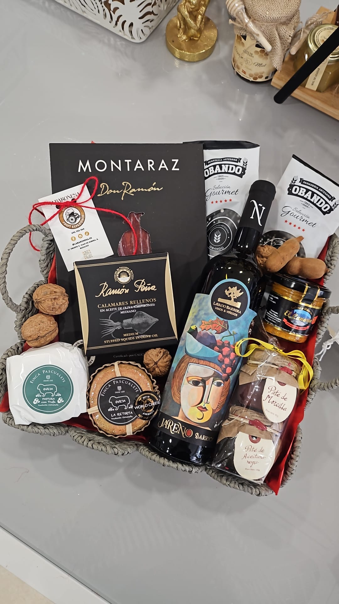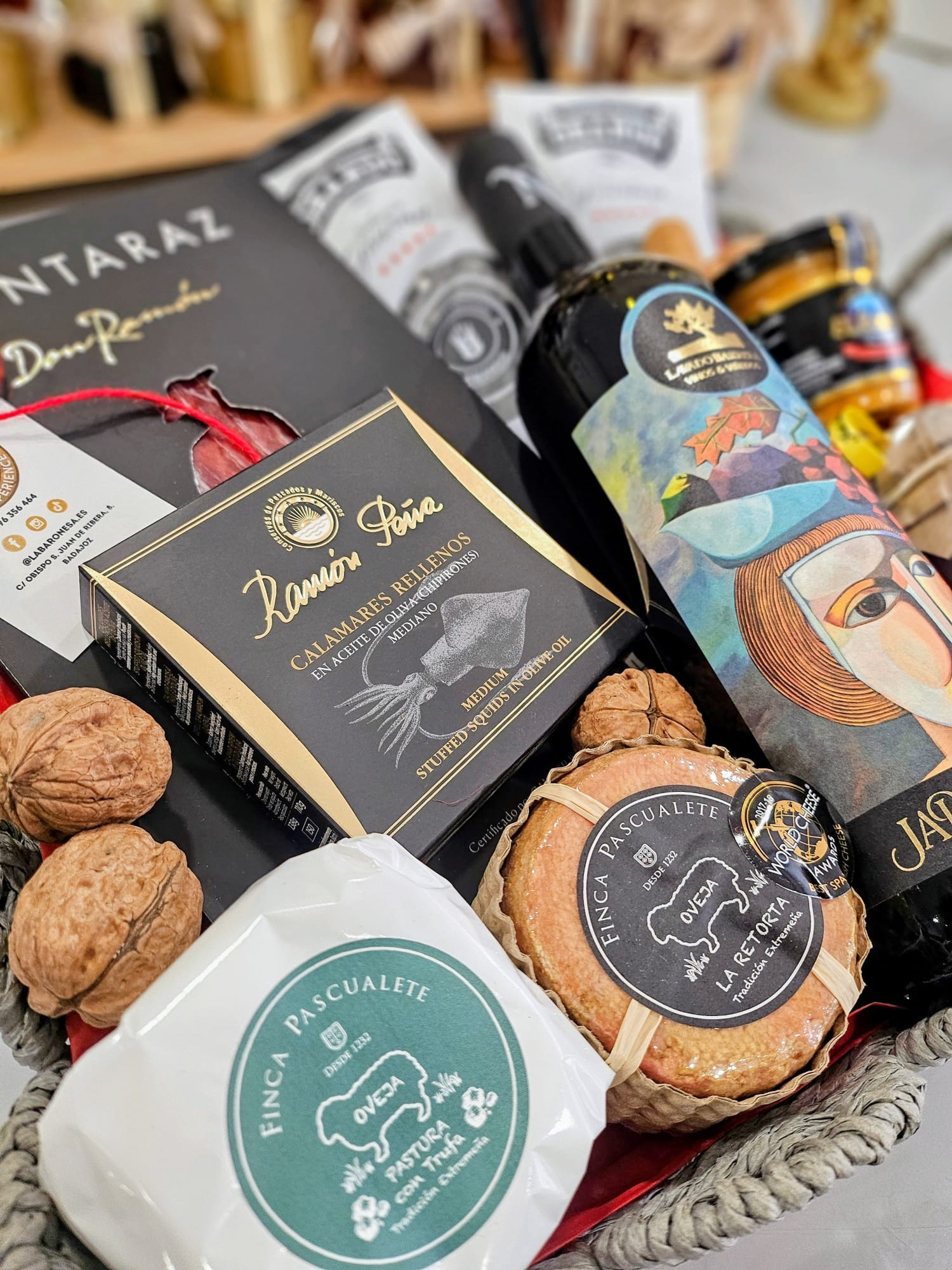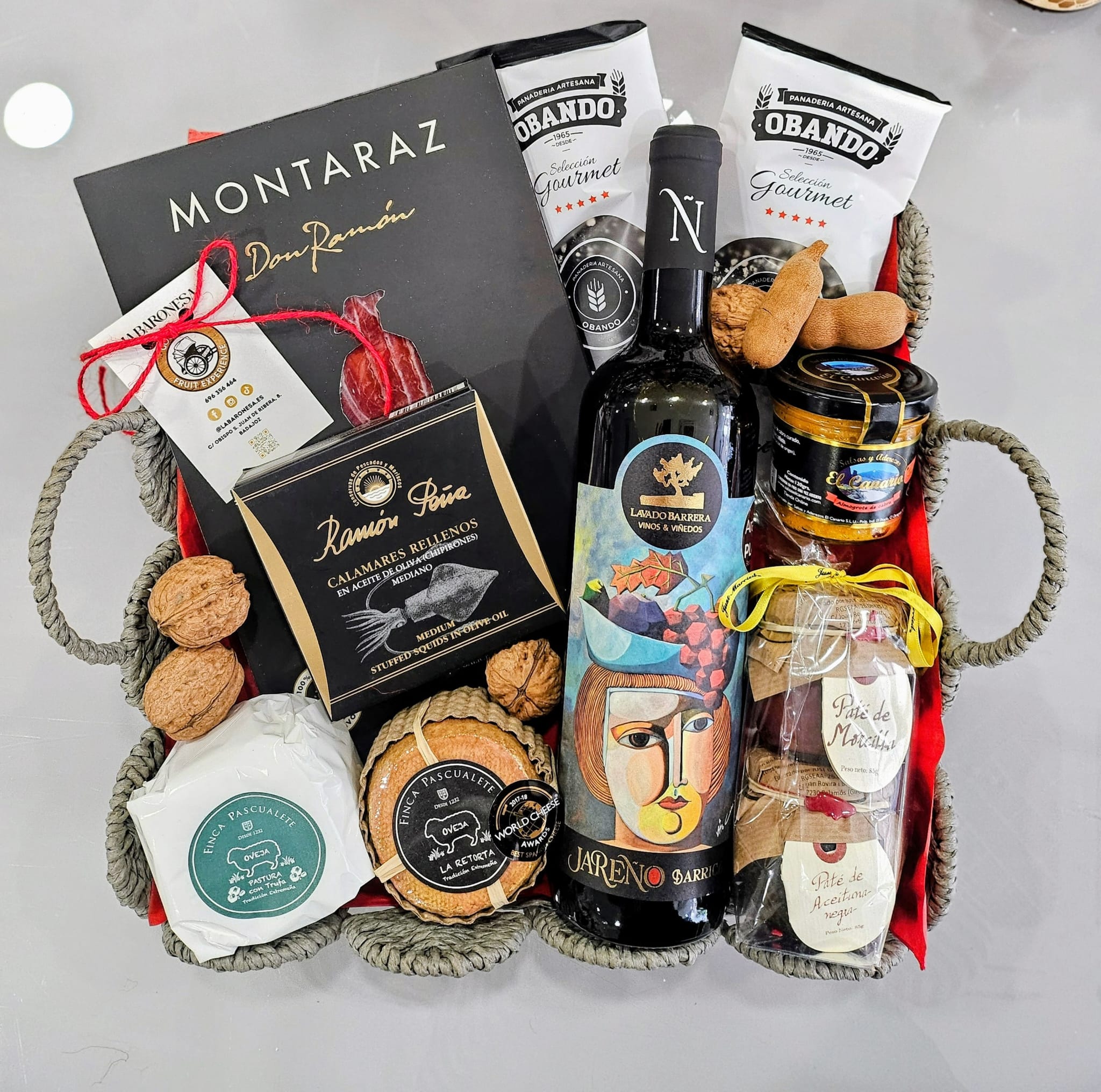 Decoración Natural: El montaje se completa con nueces enteras y fruta fresca de temporada (uvas), que se añaden en el momento del envío para garantizar su frescura.