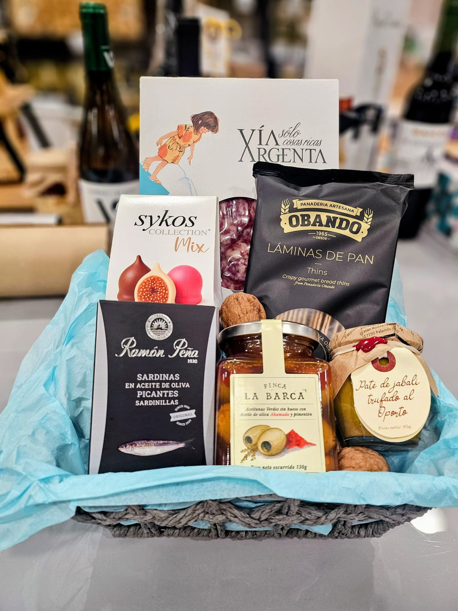 Los productos vienen dispuestos con delicadeza en una cesta de mimbre artesanal en tono grisáceo, decorada con papel de seda azul cielo, lista para regalar y disfrutar.