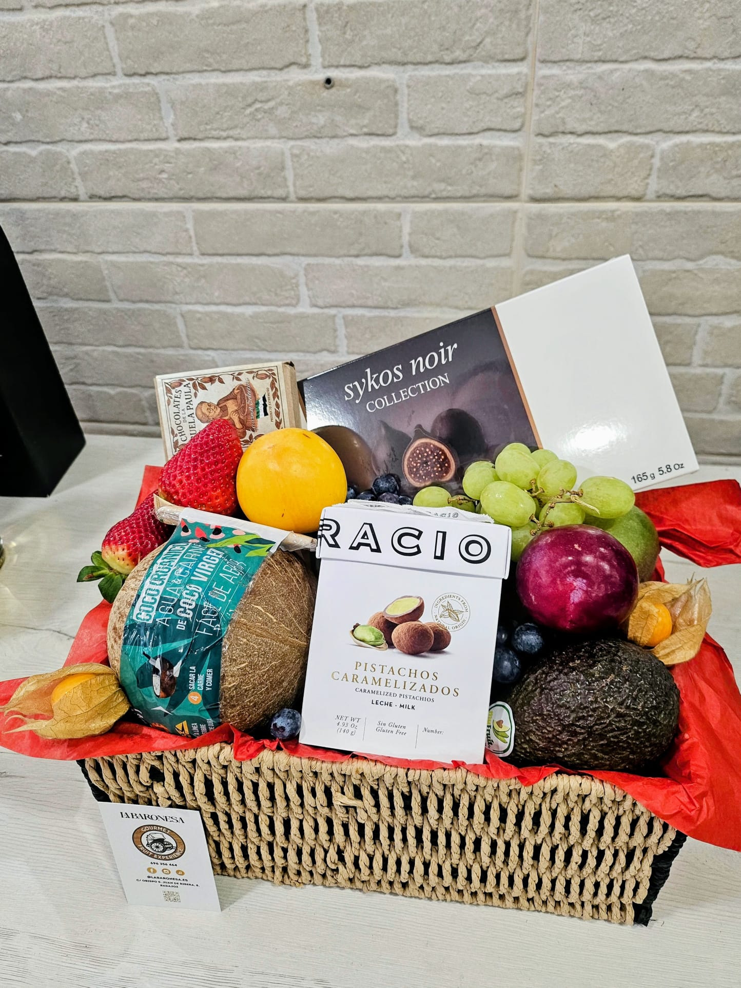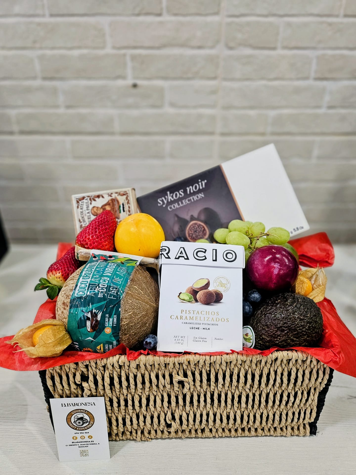 Destaca el chocolate artesanal «Chocolates de la Abuela Paula», que destaca por su cobertura crujiente. Además, incluye la «Sykos Noir Collection» y pistachos caramelizados para los paladares más dulces. La selección se completa con una variedad de frutas frescas y exóticas, como fresas, uvas, un coco entero, granadas y mangos, todas presentadas en una elegante cesta de mimbre trenzado.