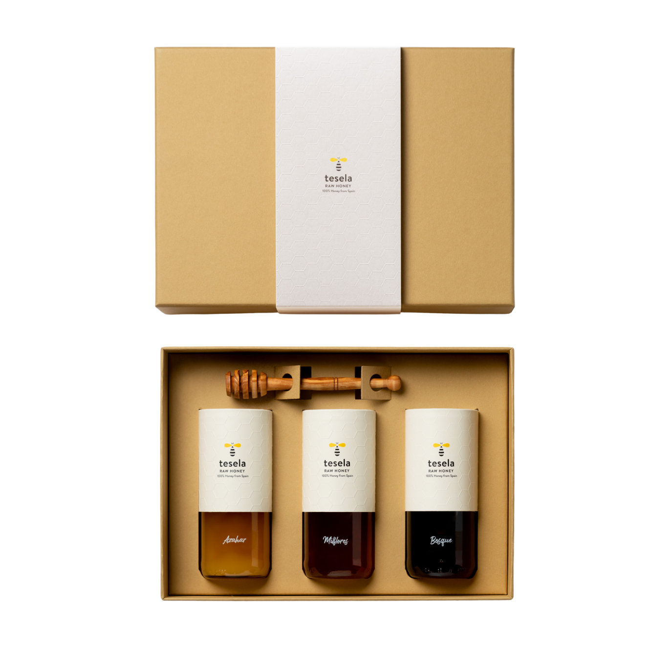 El estuche premium está realizado en papel craft y contiene 3 tarros de miel premium de 320 gramos (bosque, milflores y azahar), con nuestro exclusivo diseño sombrerera con golpe seco. Además, el conjunto se contempla con un palito de madera de olivo.