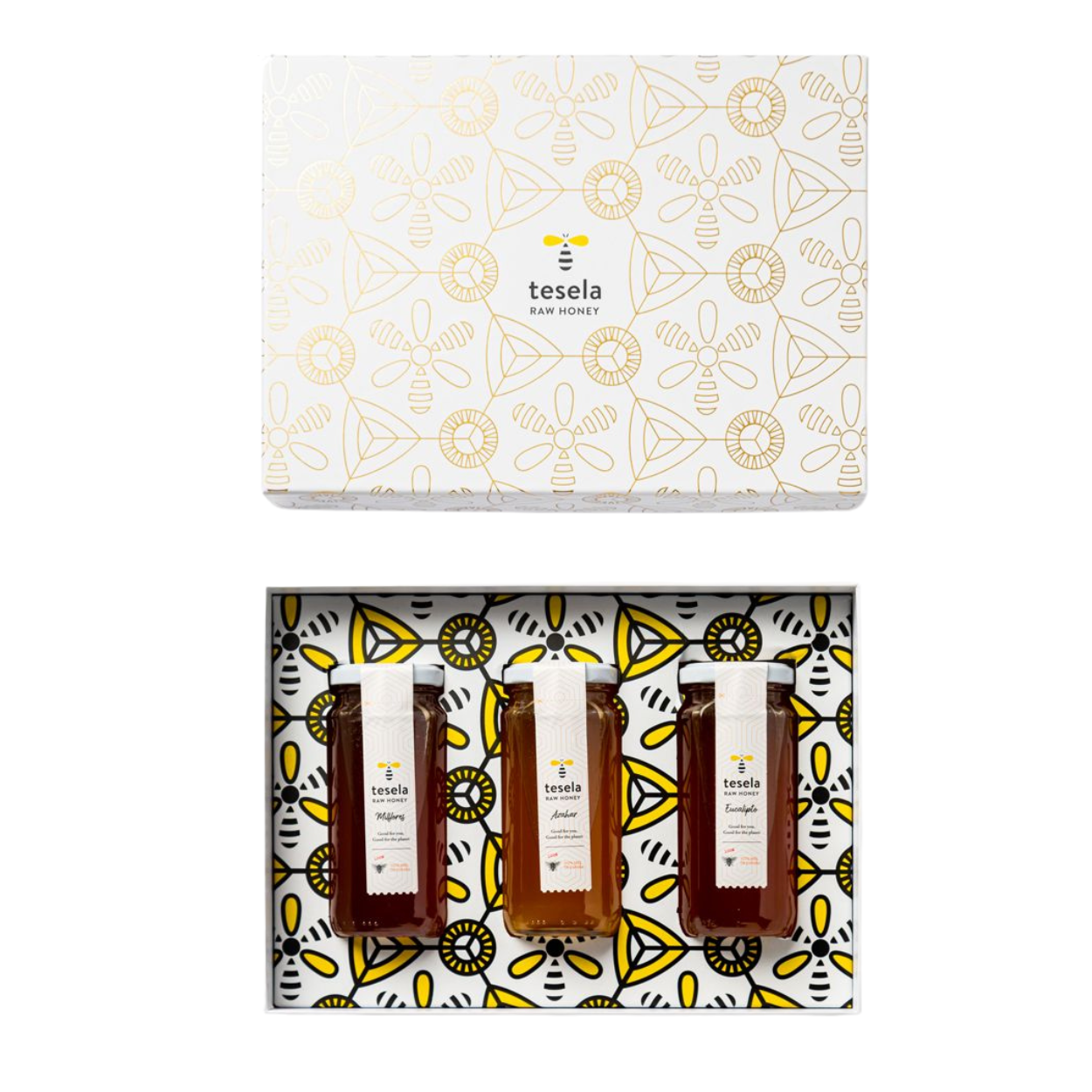 Este original estuche contiene 3 tarros de miel pura de 320 gramos (milflores, eucalipto y azahar) y se presenta en un formato rompedor con unas ilustraciones creadas por nuestros diseñadores, representando las flores, el sol y las abejas. La caja, elaborada a medida, incorpora en el exterior las ilustraciones con golpe seco de color dorado.