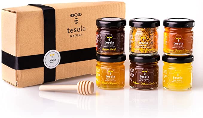 Cesta gourmet: caja decorada compuesta por 6 tarros de miel pura de abeja y polen de abeja natural: miel de bosque, miel de cantueso, miel milflores, polen de abeja natural y miel calluna (alternativa a la miel de manuka).