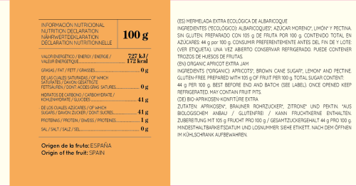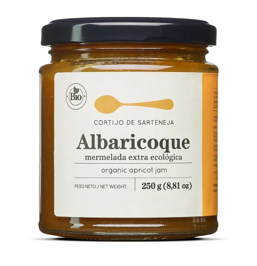 Nuestra mermelada de albaricoque ecológica está elaborada con albaricoques frescos y azúcar moreno de cultivo ecológico. Con 105g de fruta por cada 100g de mermelada y un contenido total de azúcares de 44g por cada 100g, es perfecta para tus desayunos y postres.