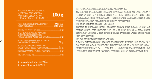 Nuestra mermelada de naranja amarga ecológica está elaborada con naranjas amargas frescas y azúcar moreno de cultivo ecológico. Con 83g de fruta por cada 100g de mermelada y un contenido total de azúcares de 59g por cada 100g, es perfecta para tus desayunos y postres.